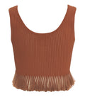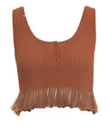 This exclusive sleeveless top by Elisabetta Franchi features a sophisticated design with a fine ribbed texture. The fashionably cropped silhouette is stylishly complemented by a playful ruffled hem at the bottom. A short button placket at the classic round neckline and subtle gold-tone logo details on the shoulder add elegant accents and emphasize the luxurious look of this versatile piece.
