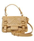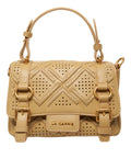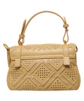 This elegant leather handbag impresses with its artistic perforated pattern and fine braided details on the flap. The model features a practical top handle and decorative buckle closures on the front, which emphasize its luxurious character. A subtle logo lettering in a gold-colored look harmoniously completes the sophisticated design of this high-quality bag.