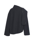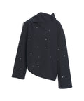This elegant jacket captivates with its sparkling strass applications, which add a glamorous accent to the design. It features a striking, draped high collar and wide sleeves, creating a modern silhouette. The asymmetrical hem emphasizes the contemporary cut of this versatile garment, combining elegance and casual chic.