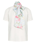 This luxurious Liu Jo White t-shirt, made of pure cotton, features a flattering V-neck and short sleeves. An integrated scarf with a refined floral print enhances the piece, creating a sophisticated shawl collar effect. The soft fabric ensures exceptional comfort and a pleasant feel against the skin. Made in Italy, it embodies effortless elegance and original design.