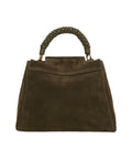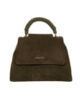 This luxurious handbag by Orciani is crafted from high-quality suede and impresses with its elegant design. The distinctive braided handle gives it a unique touch. With its practical flap closure and subtle logo detail, it is a stylish accessory. Made in Italy.