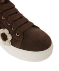 The luxurious suede sneakers 'PIA446A' by Gio+ feature a striking platform sole for an elevated look. They are adorned on the side with detailed, flower-shaped appliques, one of which is additionally set with sparkling rhinestones. This model combines comfort with an unmistakable design.