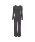 This elegant jumpsuit by Jucca features a sophisticated metallic look. The design is characterized by long sleeves, a round neckline, and wide legs. It is a stylish choice for special occasions, offering both comfort and refinement. Made in Italy.