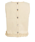 This elegant 'Madie' top stands out with its high-quality cotton blend and modern design. Distinctive ruffles at the hem and contrasting decorative stitching add a playful touch to the piece. The classic round neck and cropped silhouette ensure a contemporary look.