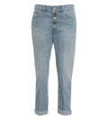 The 'Koons' jeans from Dondup feature a relaxed loose fit. Made in Italy, the high-quality cotton blend ensures a comfortable feel throughout the day. Classic elements like the five-pocket design, a distinctive button fly, and the cuffed hem highlight the modern, cropped silhouette of this premium piece.