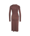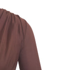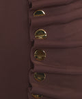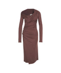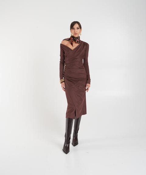 This elegant midi dress by Elisabetta Franchi features a chic asymmetrical neck and long sleeves. The artistic side ruching is adorned with distinctive decorative buttons. Crafted from flowing material, it offers a sophisticated silhouette. Made in Italy.