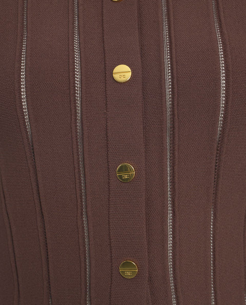 This elegant cardigan by Elisabetta Franchi features a classic round neckline and long sleeves. Characteristic vertical seam details on the front emphasize a feminine silhouette. The hem is adorned with refined ruffle details, creating a peplum effect. Decorative buttons on the front complete the stylish design.
