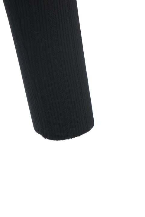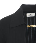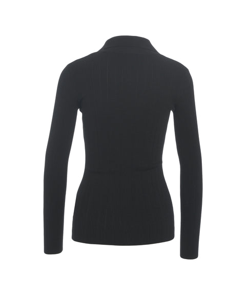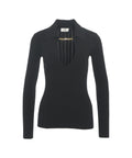 This stylish knit pullover features a ribbed texture and an elegant polo collar. A deep V-neckline is artfully accented by a delicate chain detail, creating a luxurious focal point. The fitted cut of the pullover enhances the feminine silhouette. A versatile piece for sophisticated casual looks.