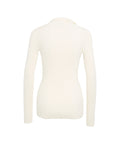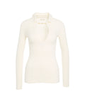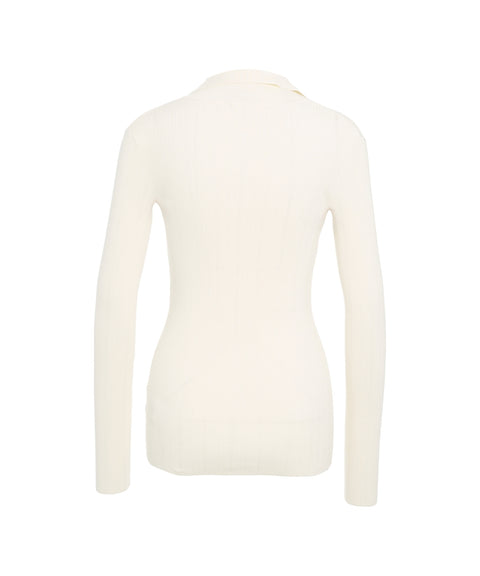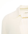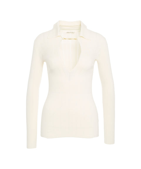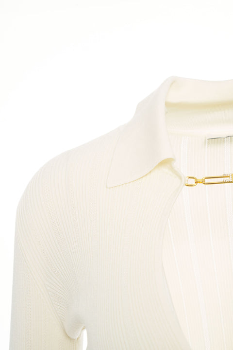 This stylish knit pullover features a ribbed texture and an elegant polo collar. A deep V-neckline is artfully accented by a delicate chain detail, creating a luxurious focal point. The fitted cut of the pullover enhances the feminine silhouette. A versatile piece for sophisticated casual looks.