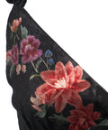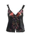 This luxurious top from Farmrio captivates with elaborate floral embroidery on soft velvet. It features an elegant V-neck, delicate ruffled straps, and a charming scalloped hem. An exquisite design that adds a refined touch to any outfit, ideal for special occasions.