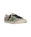 These unique 'Super-Star' sneakers by Golden Goose feature a distinctive leather design with a striking all-over stamp print. They showcase the iconic star appliqué on the side and a deliberately aged look for an unmistakable vintage charm. The model impresses with its high-quality craftsmanship and is Made in Italy.