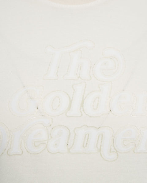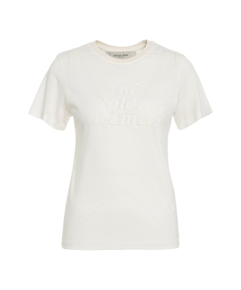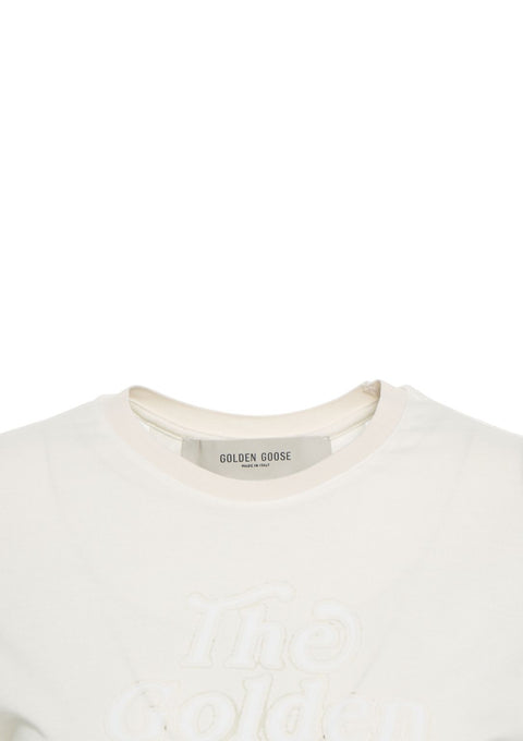 This Golden Goose T-shirt, crafted from soft cotton, features a comfortable fit and a crew neck. The model is presented with distinctive logo embroidery on the front, lending an elegant touch to the design. With short sleeves and a straight hem, it offers versatile styling options. Made in Italy.