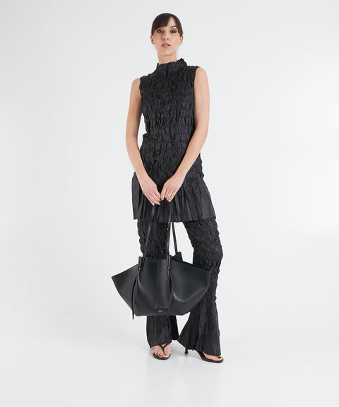 These GONGDID DESIGN pants feature a uniquely structured surface, creating a modern aesthetic. The comfortable, elasticated waistband ensures an optimal fit and maximum wearing comfort. The design is complemented by a subtly flared hem, providing an elegant silhouette. A luxurious statement piece for the modern wardrobe.