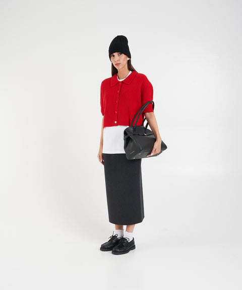 The cropped knit cardigan 'Aria' by Herskind is a versatile garment for stylish appearances. Crafted from a comfortable knit fabric, it features a classic collar and a full button front. The short, slightly voluminous sleeves and ribbed hem give this model a modern touch. It is ideal for both casual and more elegant combinations.