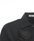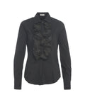 This elegant Himons blouse impresses with its sophisticated ruffle details along the button placket, adding a luxurious accent. Crafted from a high-quality material, it offers a figure-hugging silhouette with a classic collar and long sleeves. It is a versatile garment that can be worn both in the office and for special occasions.
