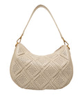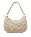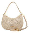 This elegant shoulder bag by La Carrie impresses with its high-quality craftsmanship in fine leather. The design features a delicate perforated pattern and artistic braided details that create a sophisticated diamond look. A practical zipper secures the main compartment, while gold-colored metal details provide a luxurious accent. The detachable shoulder strap offers versatile carrying options.