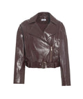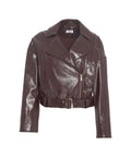 This modern jacket showcases a casual biker style with a shiny faux leather look. It features a wide lapel collar, an asymmetrical zip closure, and a waist belt that accentuates the silhouette. The cropped length gives the design a contemporary touch, making it a versatile piece for various looks.