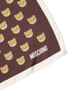 The elegant foulard from Moschino is crafted from fine silk and features a striking pattern. It showcases the iconic teddy bear design combined with graphic stripes and a logo lettering at the edge. This luxurious accessory adds a playful yet stylish touch to any outfit and was Made in Italy.