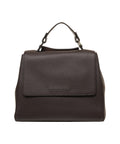 The elegant Orciani handbag, crafted from high-quality grained leather, impresses with its stylish design. It features a characteristic flap with a subtle logo detail, a sturdy top handle, and a detachable shoulder strap for versatile carrying options. This luxurious accessory was made in Italy, combining exquisite craftsmanship with timeless aesthetics.
