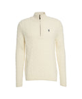 High-quality men's sweater by Polo Ralph Lauren made from soft wool, characterized by a classic cable knit pattern. It features a stand-up collar with a half-zip closure and the iconic logo embroidery on the chest. Ribbed cuffs and a ribbed hem complete the timeless design, ideal for elegant casual looks.