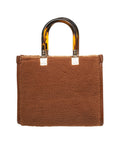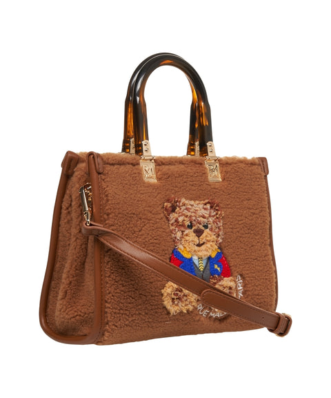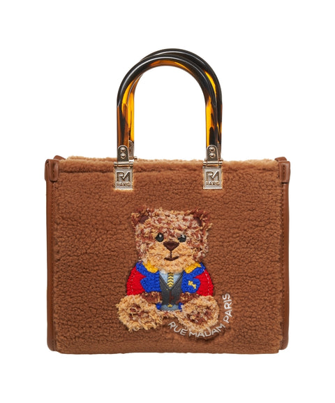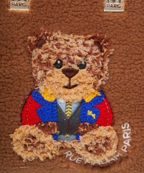 The exclusive 'Marvin' handbag by Rue Madam is a stylish accessory crafted from soft faux fur. It captivates with a detailed teddy bear application on the front, providing a playful accent. The design is complemented by elegant handles and subtle gold-colored logo details. A luxurious piece, made in Italy.