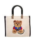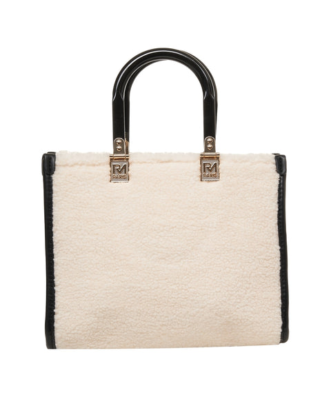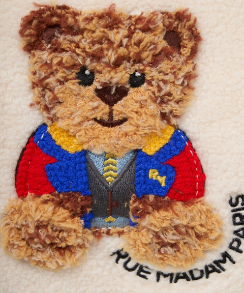 The exclusive 'Marvin' handbag by Rue Madam is a stylish accessory crafted from soft faux fur. It captivates with a detailed teddy bear application on the front, providing a playful accent. The design is complemented by elegant handles and subtle gold-colored logo details. A luxurious piece, made in Italy.