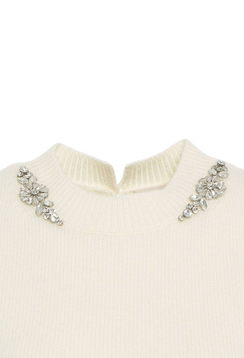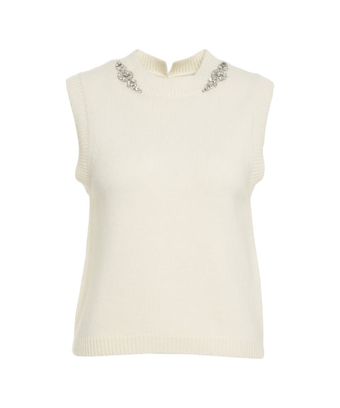 This elegant knit top by Semicouture features a sleeveless fit and a stylish stand-up collar. The shoulders are adorned with sparkling rhinestone applications, adding a luxurious touch to the piece. Crafted from high-quality knit fabric, it offers comfortable wear and a ribbed hem for a perfect fit. A versatile item, ideal for elevated occasions or as a stylish layering piece.