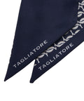 This elegant Tagliatore foulard is crafted from luxurious silk and features a sophisticated geometric pattern. Made in Italy, this versatile accessory can be styled in various ways to add a touch of flair to any outfit. The ends are finished with a subtle logo detail.