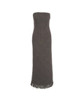 L'elegante maxi abito 'Adele' di Herskind si presenta in una silhouette lunga e aderente e con un discreto motivo glencheck. Il design senza spalline è accentuato da un raffinato orlo sfrangiato sul fondo, che conferisce al vestito una speciale dinamicità. Questo modello elegante, perfetto per occasioni sofisticate, incarna l'eleganza moderna.