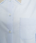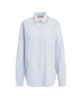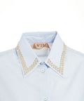 Questa elegante blusa N21 presenta un taglio classico e un colletto unico impreziosito. Le applicazioni strass sul colletto aggiungono un tocco di lusso al design. Con maniche lunghe, una tasca sul petto e un'abbottonatura nascosta, offre una vestibilità elegante. Made in Italy, incarna una squisita artigianalità.